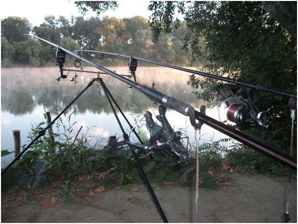 Meredek parton felállított tri-pod, rajta a botok beélesítve várják a halakat.